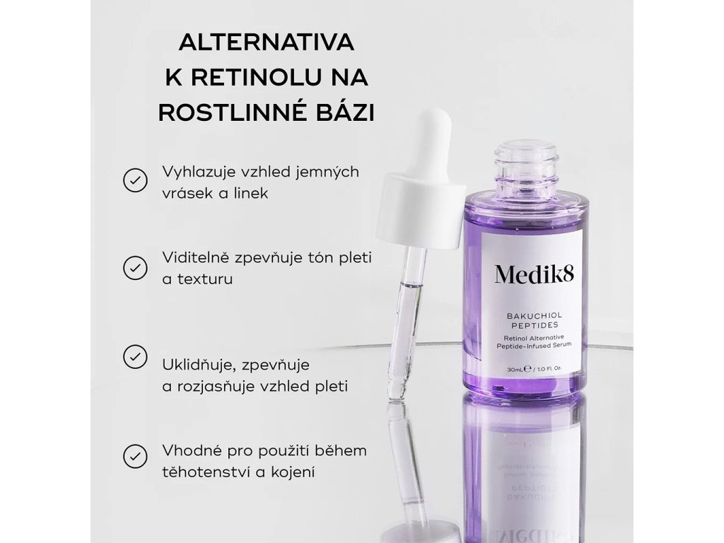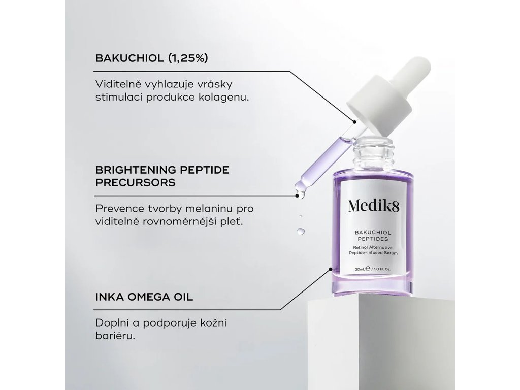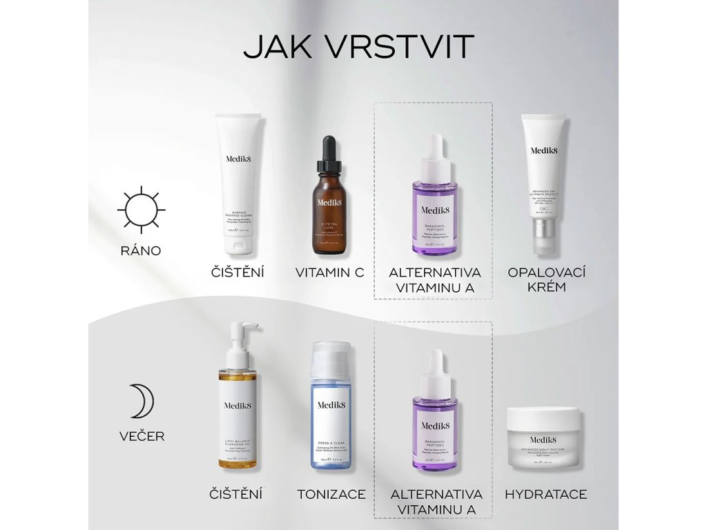 Protivrásková filozofie CSA od Medik8 spočívá v aplikaci vitamínu C a SPF ráno a používání produktu s vitamínem A večer. Pokud vitamín A používat z nějakého důvodu nemůžete, BAKUCHIOL PEPTIDES jej dokáže v péči zastoupit, přičemž BAKUCHIOL PEPTIDES můžete používat jak večer, tak ráno.