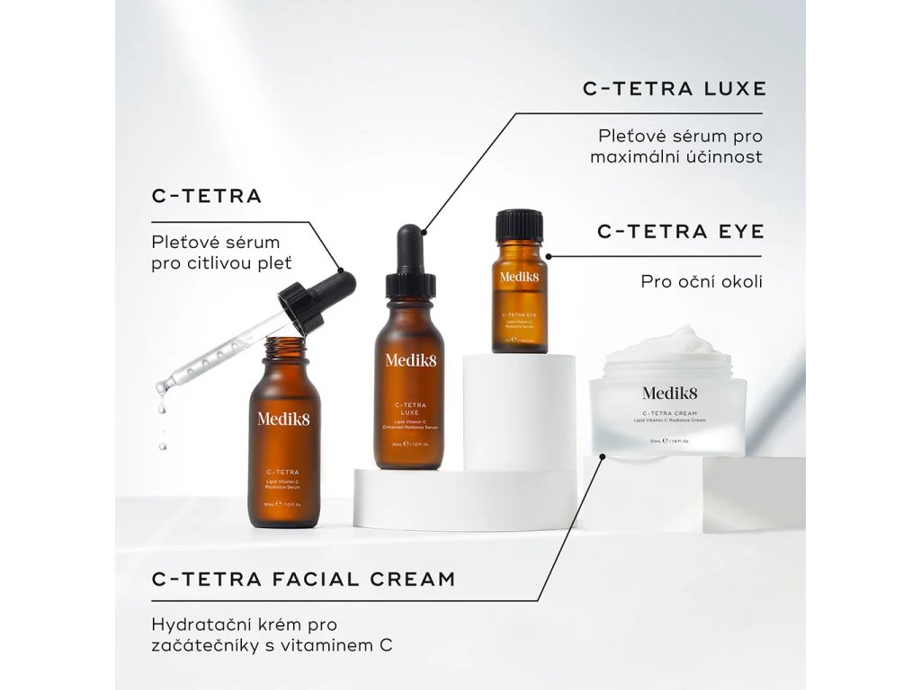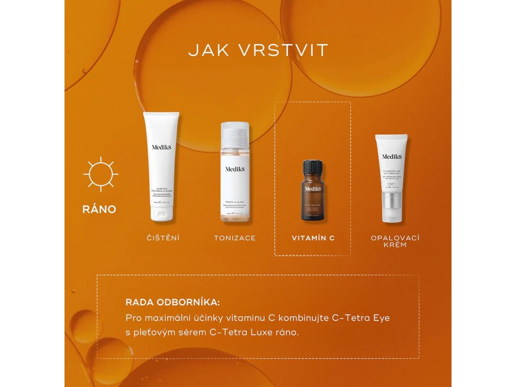 Citlivé okolí očí však vyžaduje mimořádně jemnou péči, a proto je tu C-TETRA EYE, lehké sérum, které se rychle vstřebá a přitom účinně vyhlazuje jemné linky a vrásky okolo očí. Při pravidelném používání získá vaše pleť rozjasněný a omlazený vzhled a vy se konečně zbavíte unaveného „looku“.