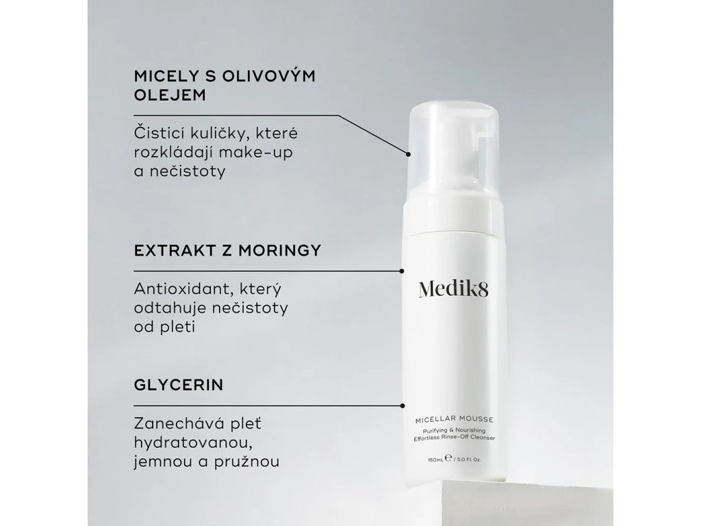 MICELLAR MOUSSE v sobě díky formě pěny spojuje to nejlepší z obou kosmetických produktů – její použití je rychlejší a snazší než běžných micelárních vod i pěnových čističů. Kombinuje v sobě jemnost bestselleru od firmy Medik8, čisticí pěny Gentle Cleanse, a odličovací sílu klasických micelárních vod.