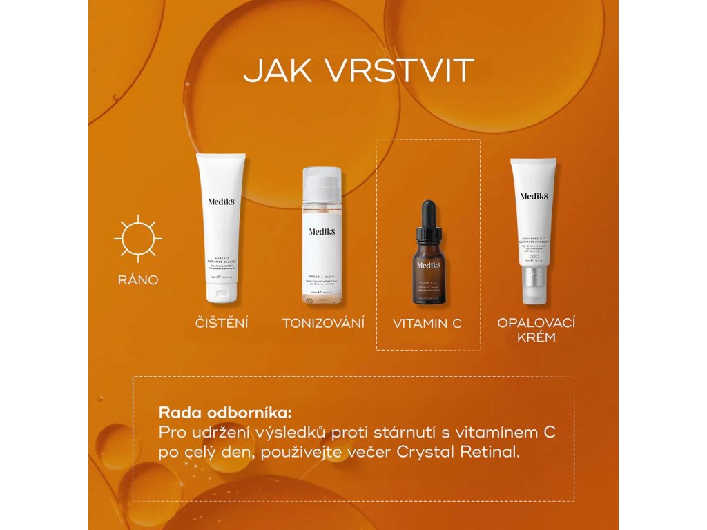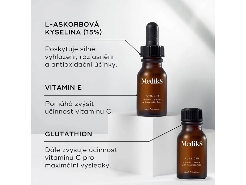 Vrásky ani tmavé skvrny mladistvému vzhledu pleti neprospívají, stejně tak jako působení volných radikálů. Sérum PURE C15 značky Medik8 ovšem dokáže proti všem těmto negativům bojovat. Minimalizuje tvorbu pigmentových skvrn, projasňuje pokožku, a protože pomáhá spouštět syntézu kolagenu v pleti, podporuje její pružnost a hustotu, což se projevuje redukcí vrásek a prevencí jejich vzniku. Působí i jako prevence stárnutí v důsledku slunečního záření.